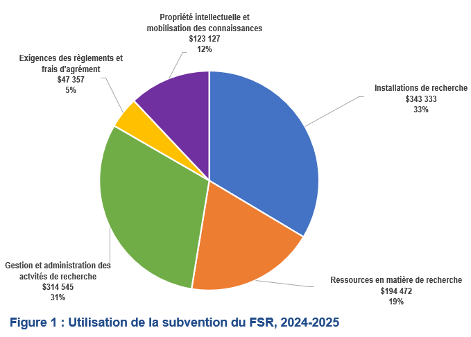 Pour l’année 2024-2025, la subvention du Fonds de soutien à la recherche (FSR) à l’Université de Moncton s’élevait à 1 022 834 $, montant qui comprenait un investissement de 2 902 $ pour la sécurité de la recherche. La figure 1 illustre comment les fonds ont été utilisés, conformément aux catégories des dépenses admissibles.