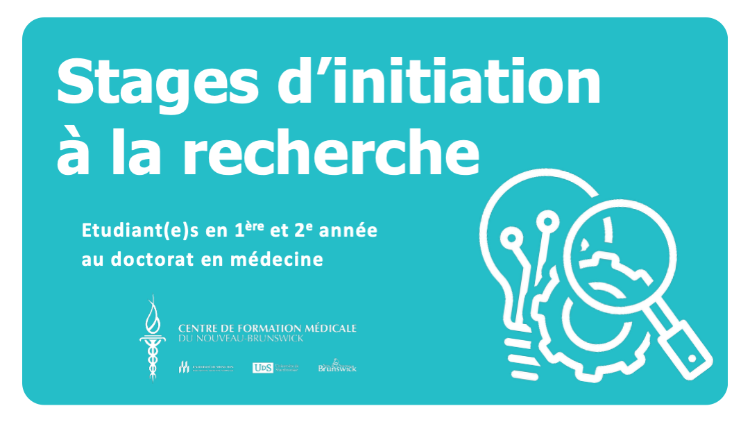Le programme de stages d'initiation à la recherche, offert en collaboration avec le ministère de la Santé, est entièrement coordonné par le Centre de formation médicale du Nouveau-Brunswick. Ces stages offrent la possibilité aux étudiantes et étudiants néo-brunswickois de 1ère et de 2ème année, inscrits dans un programme de doctorat en médecine canadien, de participer à un projet de recherche en milieux clinique, universitaire ou communautaire.