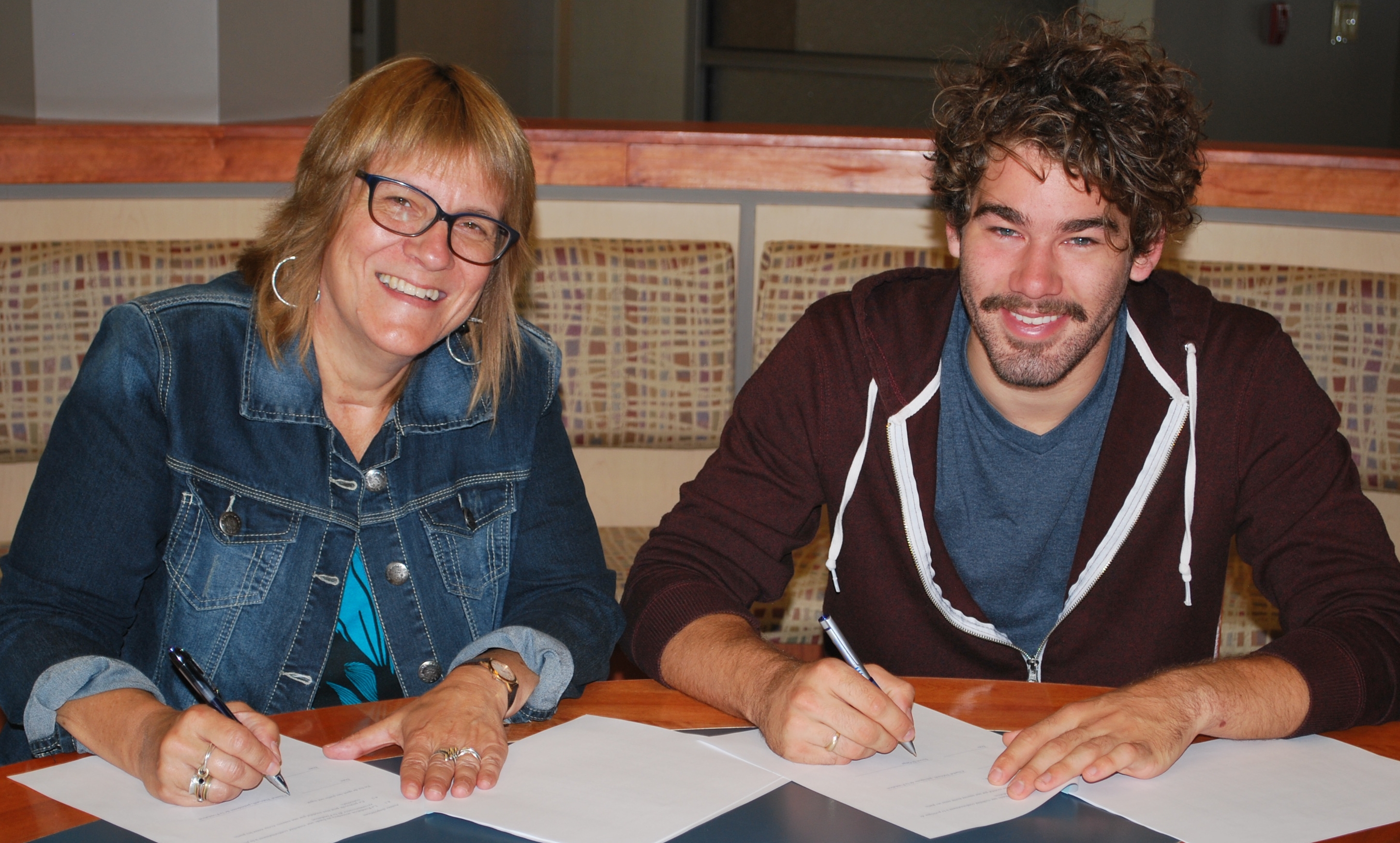 Simon St-Onge signe les documents officialisant la création de la bourse Fondation-Saint-Louis-Maillet-Michel-McSween en présence de Nicole Lang, vice-présidente de la Fondation.