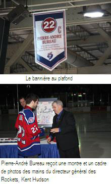 Pierre-André a disputé cinq saisons avec le Rocket, trois à Montréal et deux à Charlottetown (2000-2005) lorsque l'équipe a déménagé dans la capitale insulaire. Il détient le record du plus grand nombre de joutes disputées avec une équipe dans la LHJMQ, soit 346. Ses parents et sa famille d'accueil étaient présents à la cérémonie précédant la partie entre le Rocket et l'Océanic de Rimouski remportée 3-1 par la troupe de Patrice Cormier, de Cap-Pelé. Bureau a reçu une belle montre et un cadre orné de photos souvenirs de son passage avec le Rocket. Plusieurs amateurs l'ont approché pour sa signature.