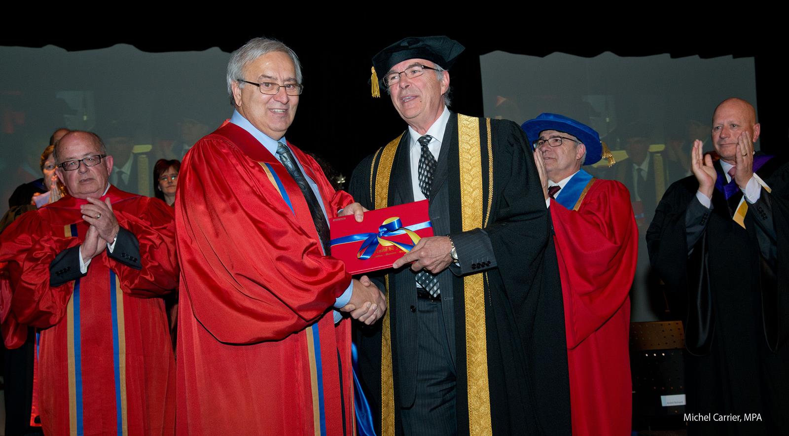 Jean-Guy Poitras, à gauche, a été élevé au rang de professeur émérite en éducation lors de la collation des diplômes au campud d'Edmundston. Dans la photo, il est félicité par le chancelier, Jean-Claude Savoie.Retourner aux nouvelles