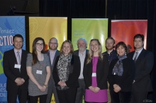 La photo fait voir, de gauche à droite, Horia-Daniel Iancu, professeur et directeur de l’ÉKL ; Kendra Thibodeau, étudiante de quatrième année en kinésiologie ; Josh Astle, directeur général des Olympiques spéciaux du Nouveau-Brunswick ; Meghann Lloyd, professeure d’UOIT et conférencière invitée ; Glen Agnew, bénévole des Olympiques spéciaux du Nouveau-Brunswick ; Lydia Porter, étudiante de troisième année en kinésiologie ; Grant Handrigan, professeur de l’ÉKL et président du comité organisateur ; Selma Zaiane-Ghalia, professeure et directrice de l’Institut de leadership de l’ÉKL, et Jean-François Richard, vice-recteur adjoint à l’enseignement de l’Université de Moncton.