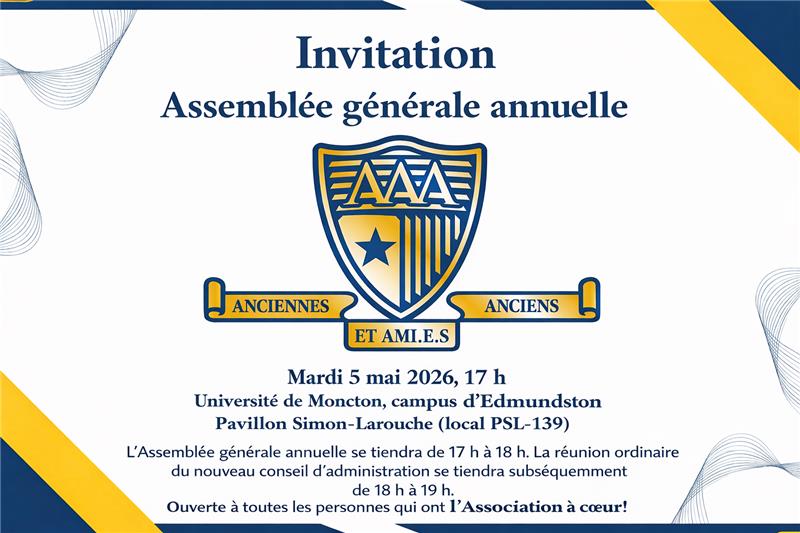 EDMUNDSTON, N.-B. – L’Association des anciennes, anciens et ami.e.s de Saint-Louis-Maillet (AAASLM) tiendra son assemblée générale annuelle, le mardi 5 mai, à 17 h, au local PSL-139 du pavillon Simon-Larouche de l’Université de Moncton, campus d’Edmundston (UMCE).