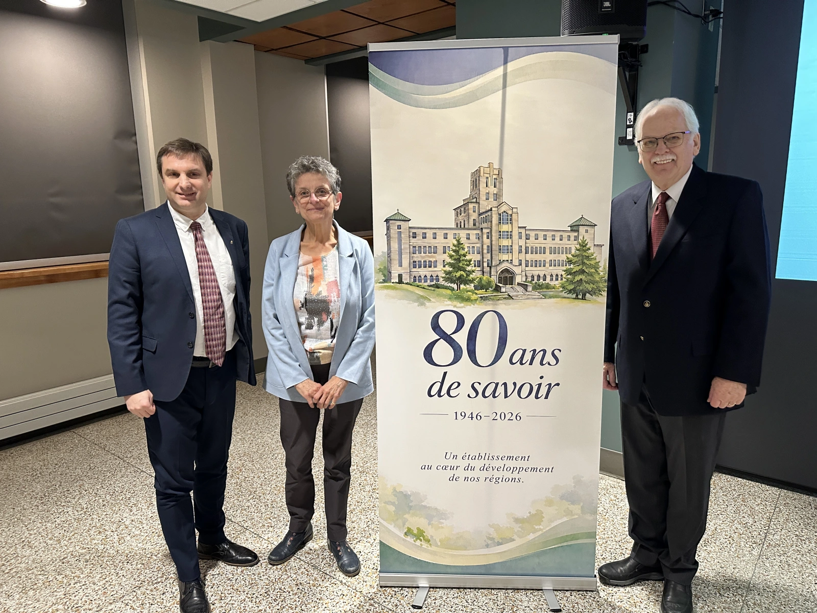 Lors de la conférence de presse, le comité a également dévoilé l’image de marque de l’évènement incluant la façade du pavillon Simon-Larouche, grand emblème des études universitaires dans le Nord-Ouest. On peut y lire « 80 ans de savoir – 1946-2026; Un établissement au cœur du développement de nos régions ».