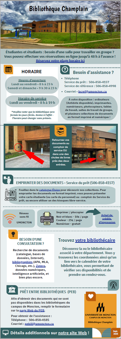 Pour toute question, adressez-vous au Service de référence en personne (1er étage de la Bibliothèque), par téléphone (506-858-4998) ou par courriel (bcref@umoncton.ca).