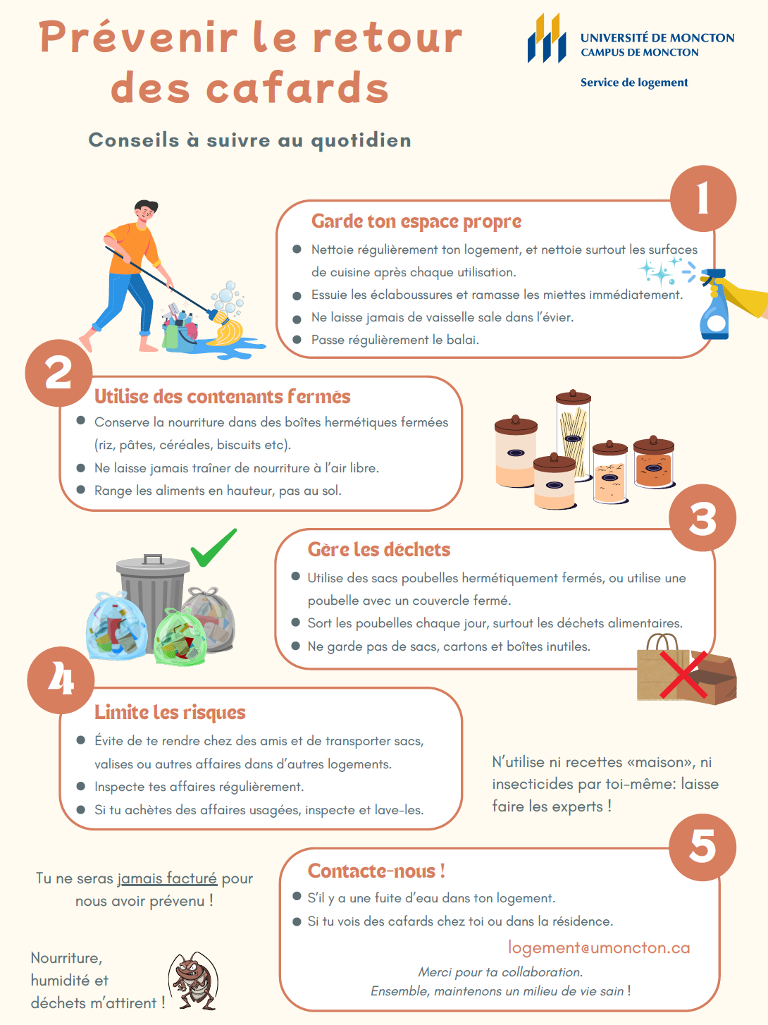 - Communiquez immédiatement avec le Service de logement à coord.logement@umoncton.ca